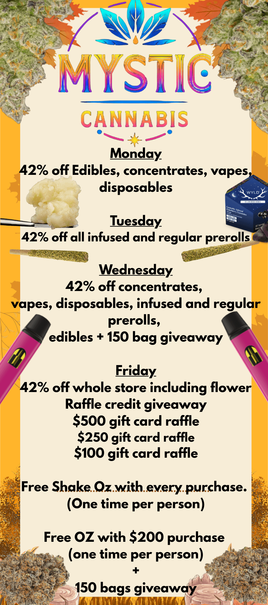Everyone loves to smoke, and we’re here to keep the good vibes rollin’! At Mystic Cannabis, we prioritize your high by offering an expansive menu of marijuana products, including flower, edibles, pre-rolls, and everything in between. With tons of favored brands, knowledgeable budtenders, endless weekly specials, and daily deals, you’ll never panic over finding the perfect strain. Oh yeah, did we mention we’re a recreational cannabis dispensary? No medical card is required! Stop into one of our locations in Southern Michigan today to experience the most down-to-earth cannabis experience! Our exceptional service ensures that every visit meets and exceeds your expectations.